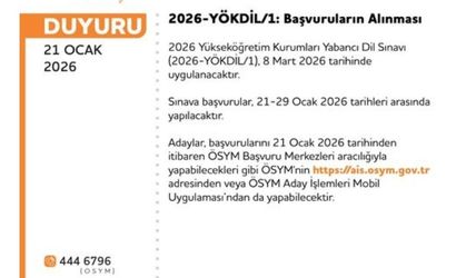 ÖSYM'nin sosyal medya üzerinden yaptığı açıklama doğrultusunda, YÖKDİL-1 sınavı 8 Mart 2026 tarihinde yapılacak. Adaylar, başvuru işlemlerini 21 Ocak 2026 saat 11.00'den itibaren, ÖSYM Başvuru Merkezleri aracılığıyla veya ÖSYM Aday İşlemleri Mobil Uygulaması ile tamamlayabilirler. Unutmayın: Başvuru tarihlerini kaçırmamak için işlemlerinizi zamanında yapmayı ihmal etmeyin.