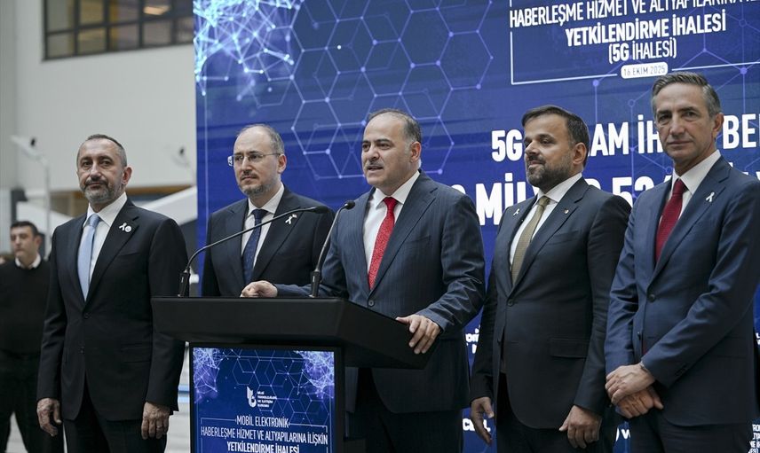 Ulaştırma ve Altyapı Bakan Yardımcısı Ömer Fatih Sayan (ortada), Bilgi Teknolojileri ve İletişim Kurumu'nda (BTK) gerçekleştirilen, 5G mobil elektronik haberleşme altyapılarının kurulması, işletilmesi ve hizmetlerin sunulmasına ilişkin yetkilendirme ihalesinin ardından basın açıklaması yaptı.