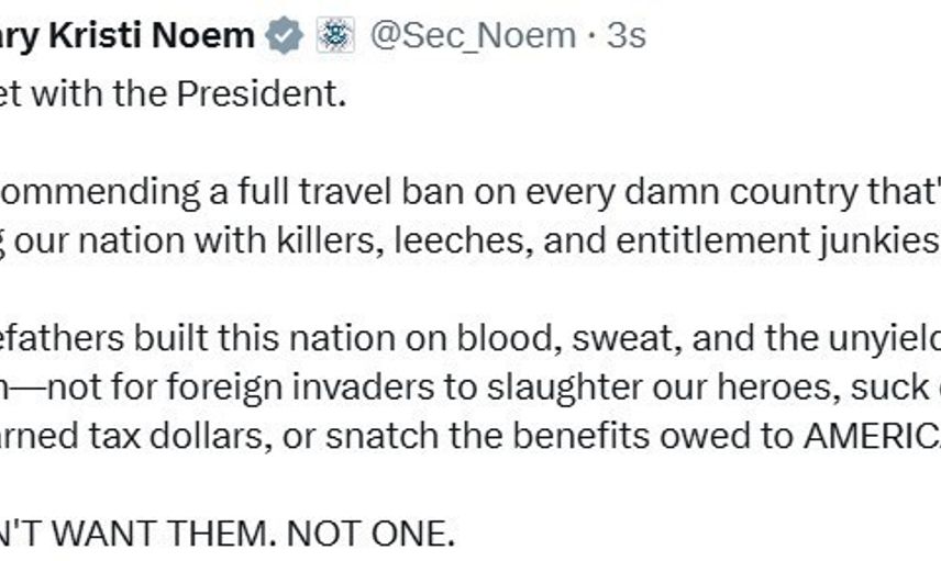 Noem, sosyal medya platformu X üzerinden yaptığı paylaşımda, "Ülkemizi katiller, sülükler ve her şeye hakkı olduğunu sanan bağımlılarla dolduran her lanet ülkeye tam seyahat yasağı uygulanmasını öneriyorum" dedi.