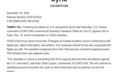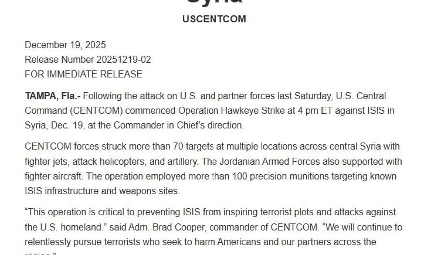 ABD Merkez Kuvvetler Komutanlığı (CENTCOM), Suriye’deki DEAŞ unsurlarına yönelik başlatılan Hawkeye Operasyonu (Şahin Gözü Operasyonu) hakkında önemli bilgiler paylaştı. Açıklamada, 70’ten fazla hedefin vurulduğu belirtildi. Bunun yanı sıra, Ürdün Silahlı Kuvvetleri de harekâta savaş uçaklarıyla destek verdi.