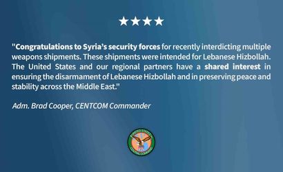 ABD Merkez Kuvvetleri Komutanlığı (CENTCOM) Komutanı Amiral Brad Cooper, Suriye'deki güvenlik güçlerinin önemli bir başarı göstererek, Hizbullah’a gidecek olan silah sevkiyatlarını durdurduğunu duyurdu.