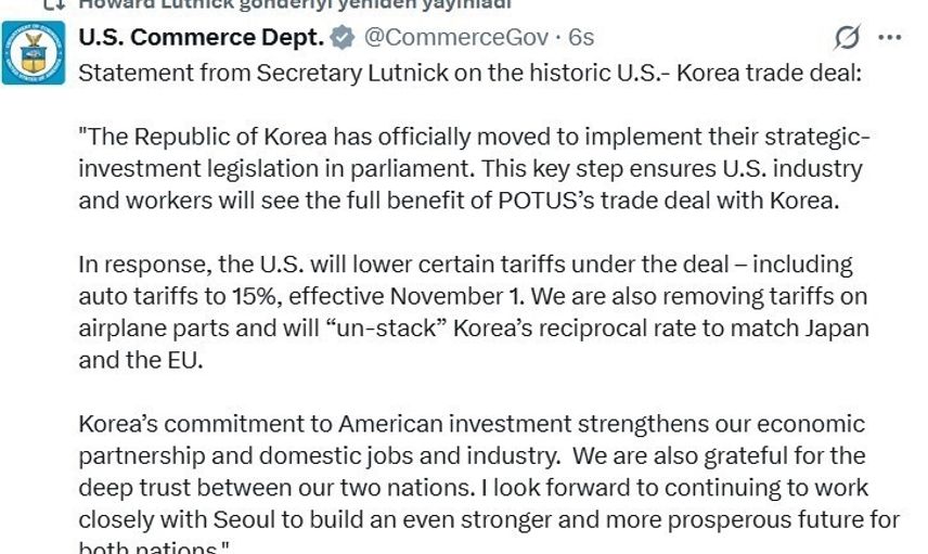 Lutnick, sosyal medya hesaplarından yaptığı açıklamada, 1 Kasım tarihi itibarıyla, Güney Kore’den ithal edilen otomobillere uygulanan %25’lik gümrük vergisinin yüzde 15’e indirileceğini duyurdu. Ayrıca, uçak parçaları üzerindeki gümrük vergilerinin kaldırılması yönünde adımlar atılacağını belirtti.