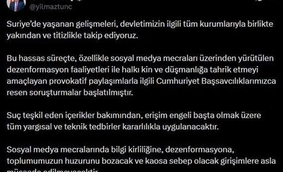 Tunç, suç teşkil eden içeriklere karşı erişim engeli başta olmak üzere her türlü adli ve teknik tedbirlerin kararlılıkla uygulanacağını vurguladı. "Sosyal medya mecralarında bilgi kirliliğine, dezenformasyona, toplumumuzun huzurunu bozacak ve kaosa sebep olacak girişimlere asla müsaade edilmeyecektir" ifadesini kullandı.