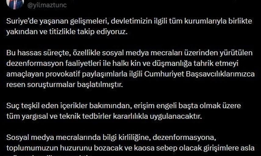 ADALET BAKANI YILMAZ TUNÇ, SURİYE’DE YAŞANAN GELİŞMELERE İLİŞKİN YAPILAN PAYLAŞIMLAR HAKKINDA, "HALKI KİN VE DÜŞMANLIĞA TAHRİK ETMEYİ AMAÇLAYAN PROVOKATİF PAYLAŞIMLARLA İLGİLİ CUMHURİYET BAŞSAVCILIKLARIMIZCA RESEN SORUŞTURMALAR BAŞLATILMIŞTIR" DEDİ.