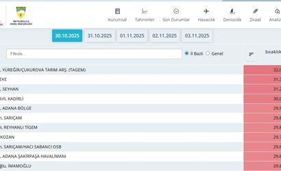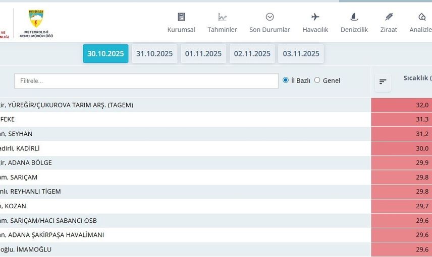 Meteoroloji Genel Müdürlüğü verilerine göre Adana’da sıcaklık 31 derecenin üzerine çıkarak Türkiye’nin en sıcak ili unvanını aldı. Sonbahar mevsiminde yağışların yok denecek kadar azalması, Şehir halkında kuraklığın giderek hissedilmesine sebep oldu. Ayrıca, önümüzdeki 1-2 hafta içerisinde yağış beklenmiyor.