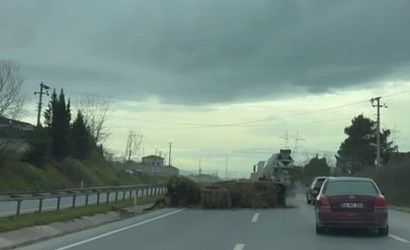 Sakarya'nın Adapazarı ilçesinde, D020 kara yolunda seyir halindeki bir tırdan düşen saman balyaları sürücüler için tehlike oluşturdu.