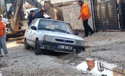 Adıyaman'da meydana gelen olayda, bir otomobil, altyapı çalışması sonrası doldurulan yolda oluşan çökme sonucu çukurda mahsur kaldı.