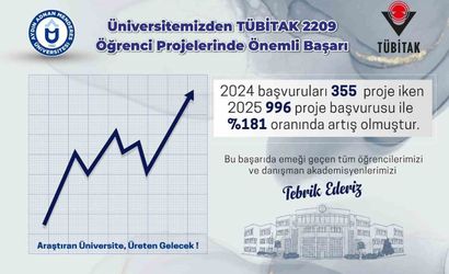 Geçtiğimiz yıl Türkiye Bilimsel ve Teknolojik Araştırma Kurumuna yapılan 355 başvuru, bu yıl %181 artış ile 2,209 projeye ulaştı. Bu durum, üniversitenin en yüksek başvuru sayısı olarak kayıtlara geçti.