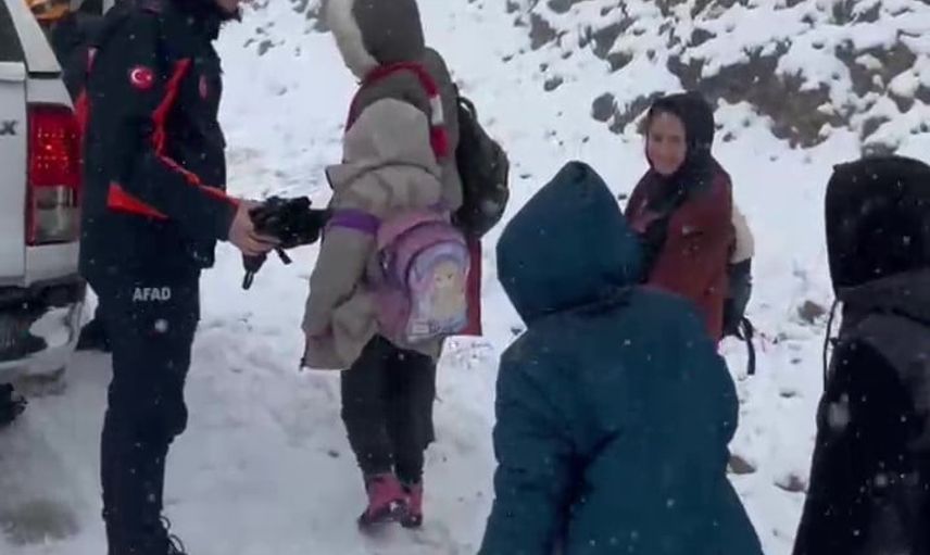 Amasya ilinde, karla kaplı yolda mahsur kalan öğrenci servisindeki çocukların imdadına AFAD ekibi yetişti.