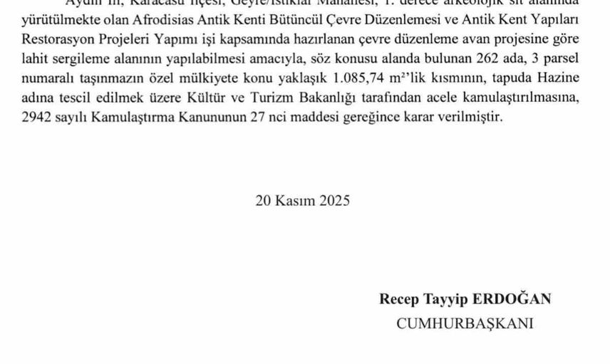 UNESCO DÜNYA MİRASI LİSTESİ’NDEKİ AFRODİSİAS’TA YILLARDIR SÜREN KAMULAŞTIRMA SORUNLARI ÇÖZÜME KAVUŞURKEN, ÇEVRE DÜZENLEMESİ VE RESTORASYON PROJELERİ KAPSAMINDA GEREKLİ GÖRÜLEN PARSELLER İÇİN YAYIMLANAN CUMHURBAŞKANI KARARI İLE ACELE KAMULAŞTIRMA SÜRECİ BAŞLATILDI.