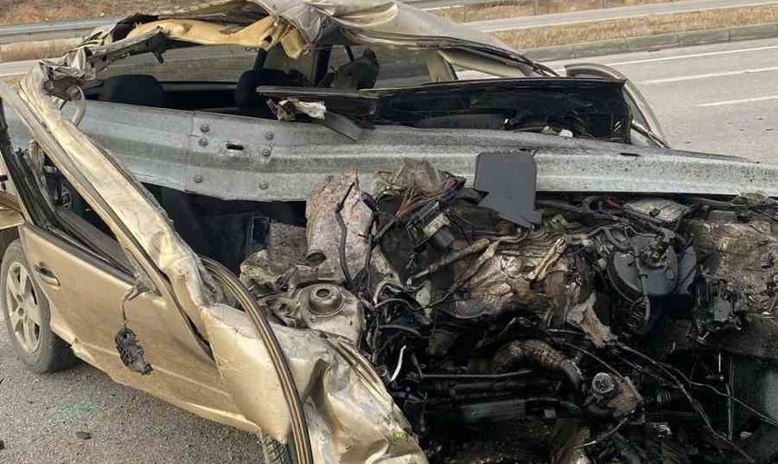 Emirdağ ilçesi çıkışında meydana gelen trafik kazasında, bir otomobil bariyerlere çarptıktan sonra bir beton direğe çarparak hurdaya döndü.
