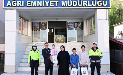 Ağrı'da, öğrenci Asmin Erdem Atatürk Anıtı'nı silerek çelenk üzerindeki ay-yıldızlı bayrağı öpüp selam verdi. İl Emniyet Müdürü Göksel Önder (solda), Asmin Erdem (sağda) ve ailesini makamında kabul ederek kutladığı öğrenciye çeşitli hediyeler verdi.