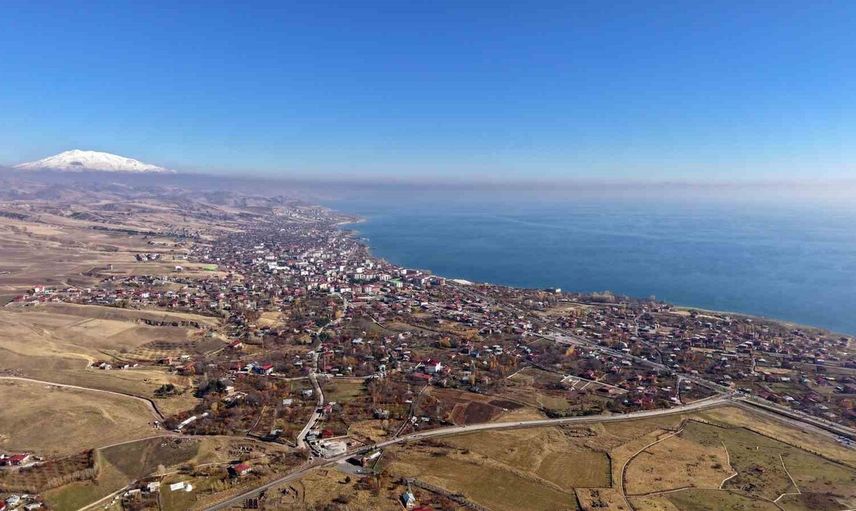 Yaklaşık 500 metre yükseklikten kaydedilen görüntüler, Ahlat’ın birçok mahallesini tek bir kadraja sığdırırken, arka planda mavi Van Gölü’nün yansıması manzaraya ayrı bir zarafet katıyor.