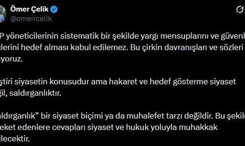 AK Parti Sözcüsü Ömer Çelik, CHP yöneticilerinin yargı mensupları ve güvenlik güçlerini sistematik olarak hedef almasını kesin bir dille eleştirdi. Çelik, bu davranışların kabul edilemez olduğunu ifade ederek, "Bu çirkin davranışları ve sözleri kınıyoruz. Eleştiri siyasetin konusudur ama hakaret ve hedef gösterme siyaset değil, saldırganlıktır" dedi.