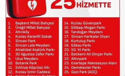 ANKARA VALİLİĞİ, ANİ GELİŞEN KALP DURMALARI VAKALARINA KARŞI OTOMATİK EKSTERNAL DEFİBRİLATÖR (OED) ŞOK CİHAZLARININ BELİRLENEN 25 NOKTAYA YERLEŞTİRİLDİĞİNİ AÇIKLADI.