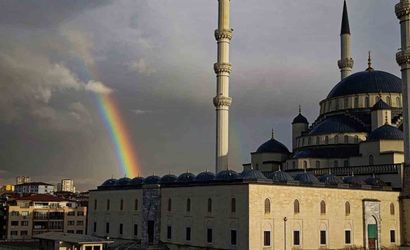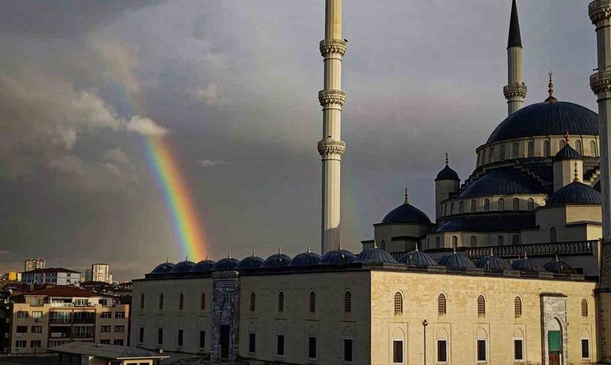 Ankara'nın simgelerinden biri olan Kocatepe Camii, yağmurun ardından oluşan gökkuşağıyla göz kamaştırdı.