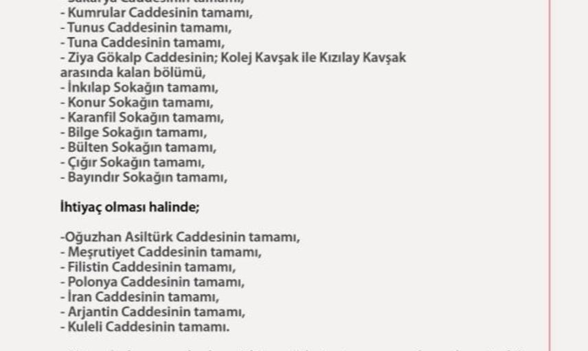 31 Aralık 2025 tarihinden itibaren saat 18.00 itibariyle bazı yollar ihtiyaç halinde çift yönlü trafiğe kapatılacak. İlgili yollar arasında Sıhhiye Orduevi ile Akay Kavşak arasındaki Atatürk Bulvarı ve birçok cadde yer almakta. Vatandaşların bu durumdan etkilenen yollar hakkında dikkatli olmaları ve toplu taşıma araçlarını tercih etmeleri öneriliyor.