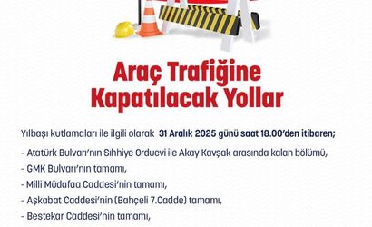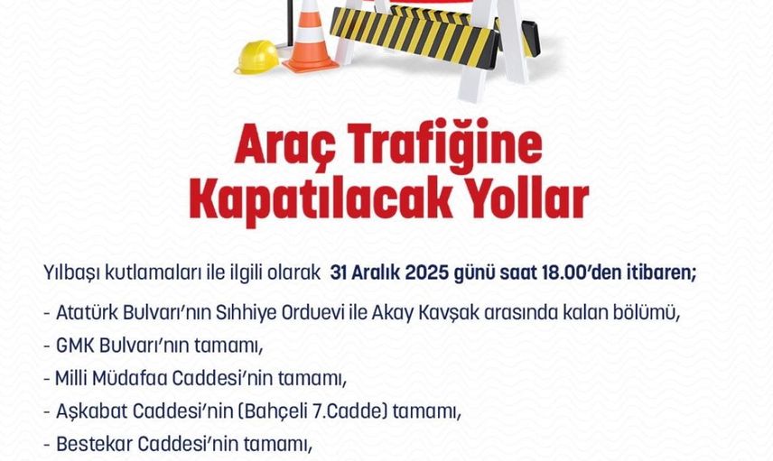 Kentin belirli bölgelerinde uygulanacak trafik düzenlemeleri ile ilgili olarak, 31 Aralık 2025 tarihinde saat 18.00 itibarıyla aşağıdaki yollar trafiğe kapatılacaktır: