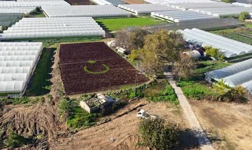 Çiftçiler, tarlalarına yaklaşık 13 bin marul dikerek, kırmızı yapraklı marulların arasına yerleştirdikleri açık yeşil kıvırcık marullarla hilal ve yıldız formunu ortaya çıkardılar. Çiftçiler, "Vatan ve bayrak sevgimizi toprağa yansıttık" diye konuştu.