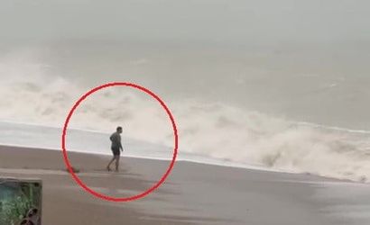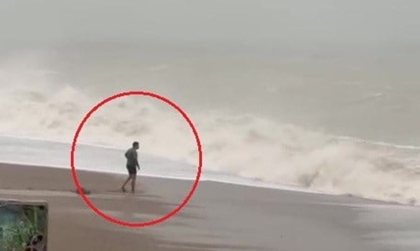 Paçalarını sıvayıp sahile inen vatandaş, aniden üzerini döven büyük dalgayı fark edince panikle geri koşmaya başladı. O anlar, başka bir vatandaş tarafından cep telefonu kamerasıyla kaydedildi. Son anda, dalgaların arasında kalmaktan kıyıdaki bir merdivene tutunarak kurtuldu.