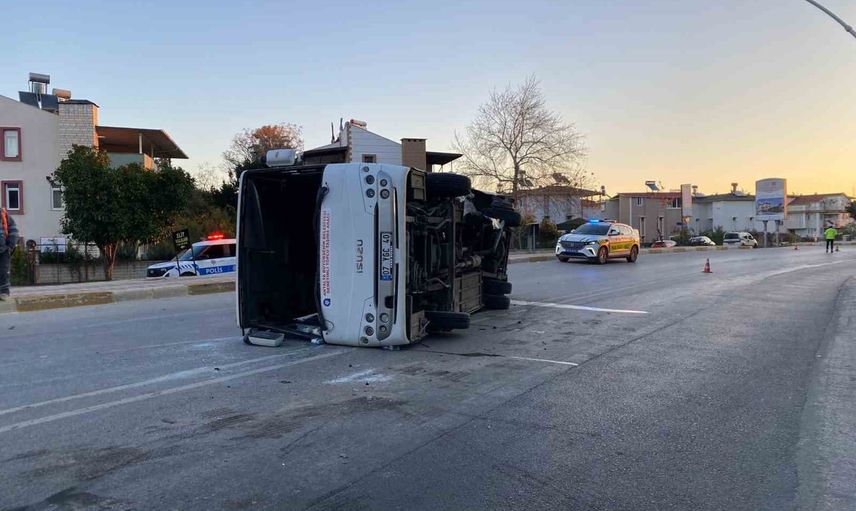 Antalya'nın Serik ilçesinde sabah saatlerinde meydana gelen bir trafik kazasında, şehir içi ulaşım yapan midibüs ile bir otomobil çarpıştı. Şiddetli çarpışmanın ardından midibüs yan yatarak zor anlar yaşattı.