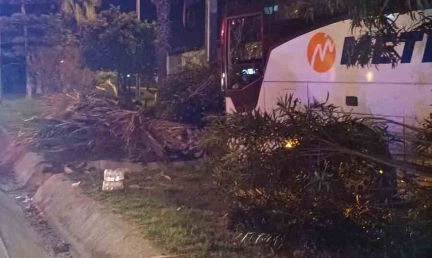 Antalya’nın Alanya ilçesinde bir yolcu otobüsü, refüjde bulunan ağaç ve aydınlatma direğine çarparak kaza yaptı. Olayda, otobüs sürücüsü ve 2 yolcu hafif yaralandı.