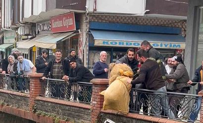 Yaklaşık kilolu bir yapıda olan sokak köpeği, bez brandayla bağlanarak halat yardımıyla dereden güvenle çıkarıldı. Kurtarma anları, çevredeki bir vatandaş tarafından cep telefonuyla kaydedildi.