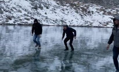 Artvin'de bir grup genç, Bülbülan Karagölü'nde eğlenceli bir gün geçirdi. Yaklaşık 3200 rakımlı göl, tamamen buzla kaplanmış durumda olduğundan gençler burada kayarak eğlenmeye karar verdi.