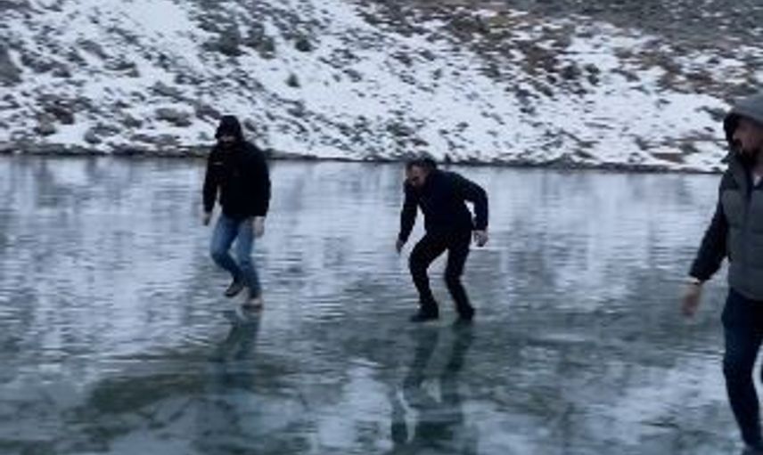 Mevsim normallerinin altında seyreden hava sıcaklığı nedeniyle göl yüzeyinde 35-40 santimetre kalınlığında bir buz tabakası oluştu. Gençler, bu renkli ve eğlenceli anları cep telefonlarıyla kaydetmeyi ihmal etmedi.