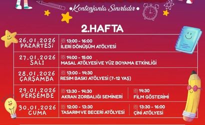 Programın başlangıcı, 19 Ocak Pazartesi günü İngilizce Atölyesi ile gerçekleştirilecek. 9-11 yaş arası çocuklar 12.00-13.30 saatleri arasında, 12-14 yaş arası grup ise 14.00-15.30 arasında pratik yapacak. 20 Ocak Salı günü, Drama Atölyesi ve Yüz Boyama Etkinliği, 14.00-15.00 saatleri arasında düzenlenecek. 21 Ocak Çarşamba günü yeniden İngilizce Atölyesi yer alacak. 22 Ocak Perşembe günü ise 7-12 yaş arası çocuklara yönelik Tuval Boyama Atölyesi ve Çini Atölyesi düzenlenecek.