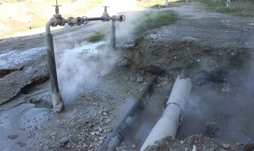 AYDIN’IN GERMENCİK İLÇESİNDE BOZKÖY YOLU ÜZERİNDEKİ JEOTERMAL AKIŞKAN İLETİM HATTINDA MEYDANA GELEN PATLAMA YOLDA TAHRİBATA NEDEN OLURKEN, İDDİAYA GÖRE YAKLAŞIK 170 DERECE SICAKLIKTAKİ SU ÇEVREYE YAYILDI.