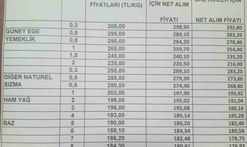 Tariş Zeytin ve Zeytinyağı Birliği tarafından yapılan açıklamada, yemeklik zeytinyağı fiyatları şu şekilde sıralandı: 0,3 asit 305 TL, 0,5 asit 295 TL, 0,8 asit 290 TL, 1 asit 265 TL, 1,5 asit 245 TL, 2 asit 225 TL. Diğer naturel sızma yağların fiyatlarına ise, 0,3 asit 295 TL, 0,5 asit 285 TL, 0,8 asit 280 TL, 1 asit ham yağ ise 202 TL olarak belirlendi.