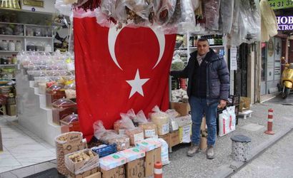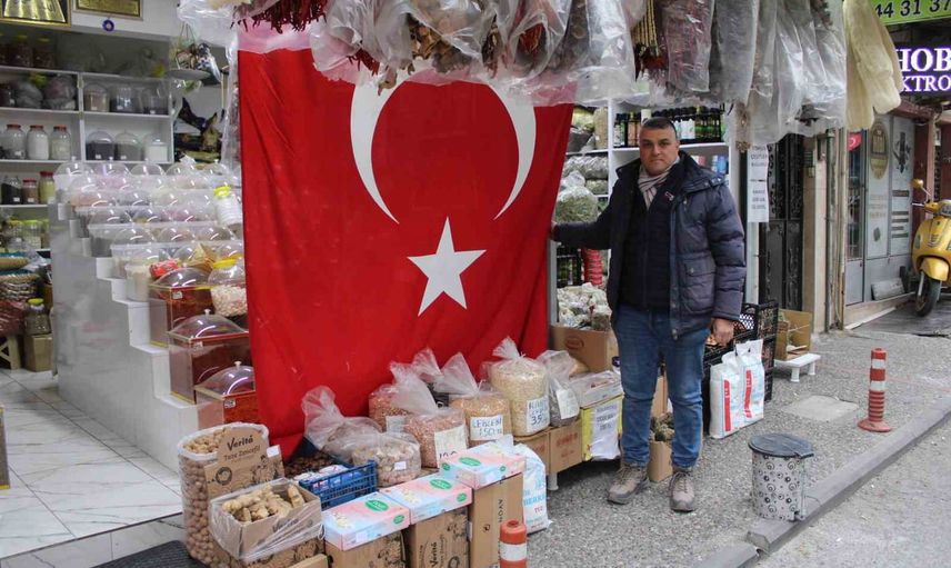 Aydın’ın Efeler ilçesinde, baharatçılık yapan esnaf Mustafa Yalçınkaya, Nusaybin-Kamışlı sınırındaki terörist yandaşlarının Türk bayrağına yönelik saldırısını kınadı. Yalçınkaya, işyerine astığı 5 metrelik bayrakla "Bayrağımızı indirmeye kimsenin gücü yetmez" diyerek birlik mesajı verdi.