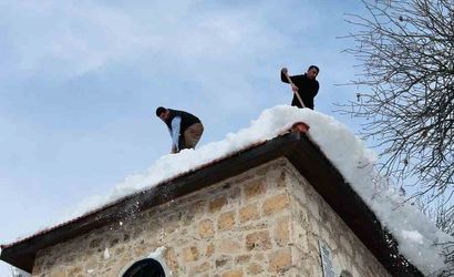 Hakkari’nin Şemdinli ilçesinde etkili olan yoğun kar yağışının ardından Bağlar köyündeki tarihi türbelerin çatısındaki kar kütleleri, köy muhtarı ve imamı tarafından temizlendi.