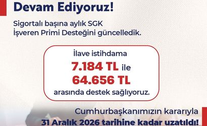 ÇALIŞMA VE SOSYAL GÜVENLİK BAKANI VEDAT IŞIKHAN, "İŞVERENLERİN İSTİHDAM ETTİKLERİ HER SİGORTALI ÇALIŞAN İÇİN AYLIK SGK İŞVEREN PRİMİ DESTEĞİ’Nİ GÜNCELLEDİK. İLAVE İSTİHDAMA 7 BİN 184 LİRA İLE 64 BİN 656 LİRA ARASINDA DESTEK SAĞLIYORUZ" DEDİ.