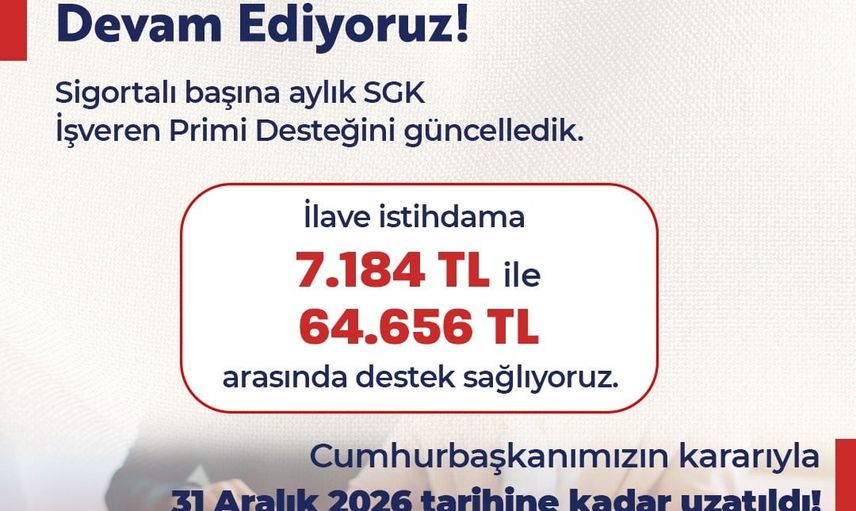Çalışma ve Sosyal Güvenlik Bakanı Vedat Işıkhan, işverenlerin istihdam ettikleri her sigortalı çalışana yönelik yeni bir destek paketini duyurdu. Sosyal medya hesapları üzerinden bilgi veren Bakan Işıkhan, "İşverenlerin istihdam ettikleri her sigortalı çalışan için aylık SGK İşveren Primi Desteği’ni güncelledik. Bu çerçevede ilave istihdama sağladığımız destek miktarı, 7 bin 184 lira ile 64 bin 656 lira arasında değişiklik göstermektedir," dedi.