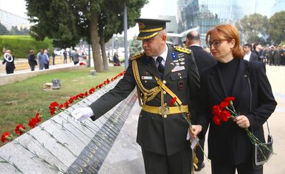 Büyükelçi Akgün, Şehitlik Anıtı’na çelenk koyarak şehitlerin anısına saygı duruşunda bulundu. Ardından, Azerbaycan Savunma Bakanlığı Askeri Bandosu tarafından İstiklal Marşı ve Azerbaycan Milli Marşı seslendirilerek saygı gösterildi.