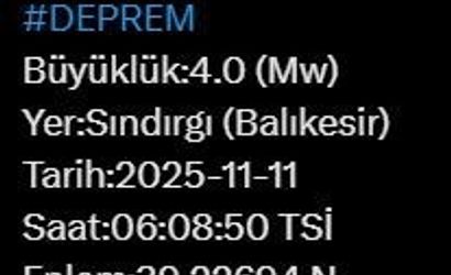 Afet ve Acil Durum Yönetimi Başkanlığı (AFAD), Balıkesir’in Sındırgı ilçesinde 4 büyüklüğünde bir depremin gerçekleştiğini duyurdu.