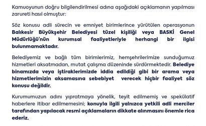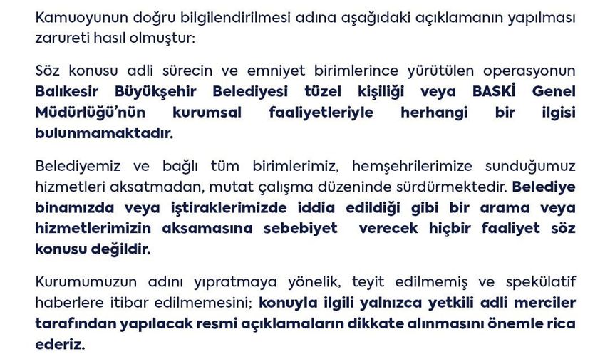 “Bazı basın yayın organlarında ve sosyal medya mecralarında, Balıkesir Büyükşehir Belediyemiz ve iştirakimiz olan BASKİ Genel Müdürlüğü'ne yönelik bir operasyon gerçekleştirildiğine ve personelimizin gözaltına alındığına dair iddialar yer almaktadır. Söz konusu adli sürecin ve emniyet birimlerince yürütülen operasyonun Balıkesir Büyükşehir Belediyesi tüzel kişiliği veya BASKİ Genel Müdürlüğü’nün kurumsal faaliyetleriyle herhangi bir ilgisi bulunmamaktadır.”