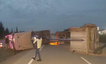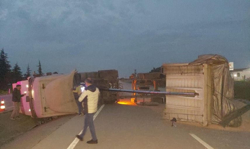 Balıkesir'in Bandırma ilçesi ile Susurluk arasında yaşanan bir trafik kazası, gidiş yönünü etkiledi. Sürücüsünün direksiyon kontrolünü kaybetmesi sonucunda hububat yüklü bir TIR, karşı şeride geçerek devrildi.