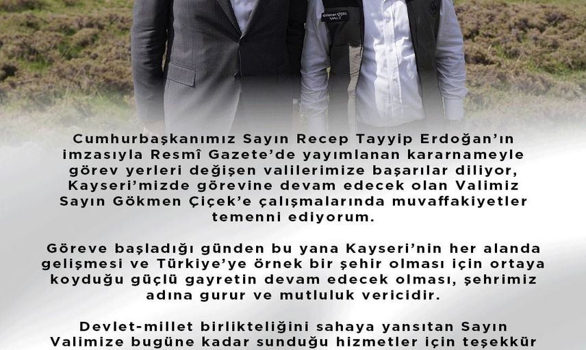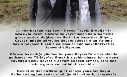 Okandan, Cumhurbaşkanı Recep Tayyip Erdoğan tarafından yayımlanan kararnameyle görev yeri değişen valilere de başarı dileklerinde bulundu. Gökmen Çiçek’e, Kayseri’deki yeni döneminde muvaffakiyetler dileyen Okandan, "Devlet-millet birlikteliğini sahada yansıtan valimize bugüne kadar verdiği hizmetlerden dolayı teşekkür ediyoruz. Birlikte şehrimiz için çalışmaya devam edeceğiz" ifadelerini kullandı.