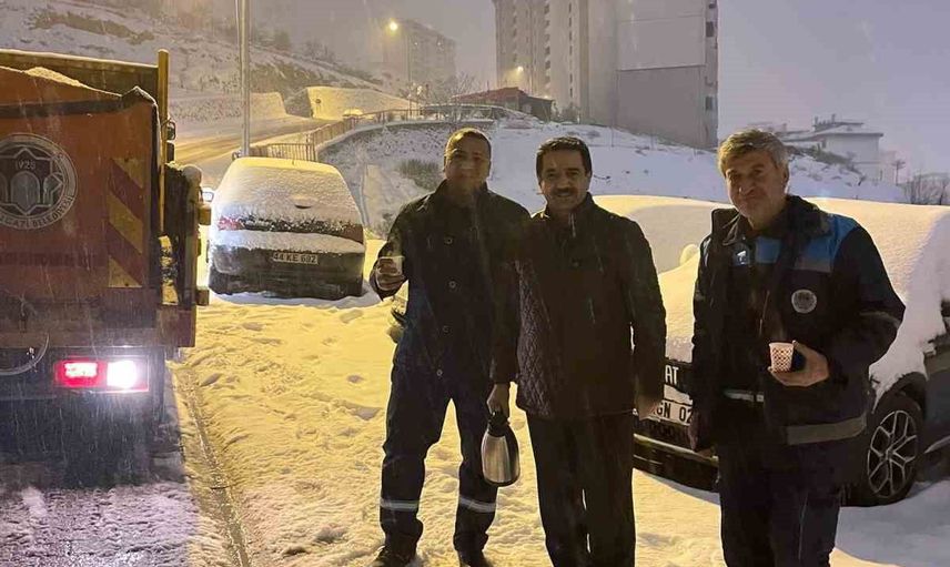 Başkan Taşkın, gece kar yağışı süresince sahada çalışan ekiplere çay ikram ederek, gösterdikleri özveriden dolayı teşekkür etti. Vatandaşların huzuru için ekiplerin sürekli teyakkuzda olduğunu belirten Taşkın, yapılan çalışmaların önemini ifade etti.
