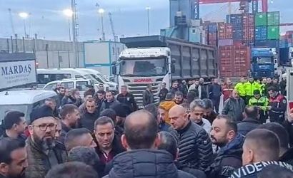 BEYLİKDÜZÜ AMBARLI LİMANINDA TIR ŞOFÖRLERİ, 10 GÜNDÜR YAŞANDIĞI İDDİA EDİLEN UZUN BEKLEME SÜRELERİNE TEPKİ GÖSTERMEK AMACIYLA LİMAN İÇERİSİNDEKİ BİR İŞLETMENİN GİRİŞİNİ KAPATTI. GİRİŞİ KAPATAN TIR ŞOFÖRLERİ LİMANDA PROTESTO GERÇEKLEŞTİRDİ. EYLEM NEDENİYLE BÖLGEDE TRAFİK DURMA NOKTASINA GELDİ.