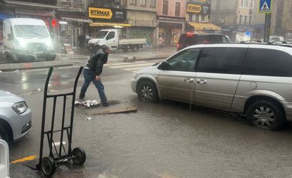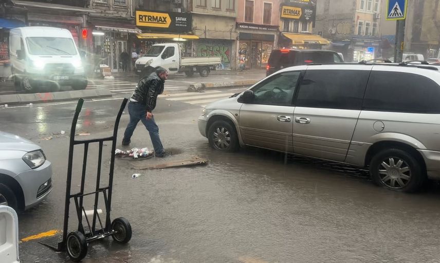 Karaköy Perşembe Pazarı’ndaki esnaf, yağmur nedeniyle zor anlar yaşadı. Bazı esnaflar, kapılarının önüne yerleştirdikleri kum torbalarıyla su baskınlarını önlemeye çalışırken, diğerleri ise yolları fırça yardımıyla süpürmeye gayret etti. Bir esnaf, göle dönen yolda yüzen metal kutuları tutarak suyun tahliyesini sağladı.