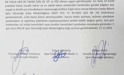 2025-2026 A Grubu 30 Kasım, B Grubu ise 29 Kasım’da 7 maç ile start alacak olan lig öncesi, Bilecik İl Emniyet Müdürlüğü tarafından yapılan bir açıklama, deplasman seyircisinin yokluğunda maçların oynanacağına dair kararı içeriyordu. Söz konusu karar, Kulüplerin başkanlarına İl Spor Güvenlik Kurulu Kararı olarak iletildi, ancak kulüp başkanları bu durumu protesto etti.
