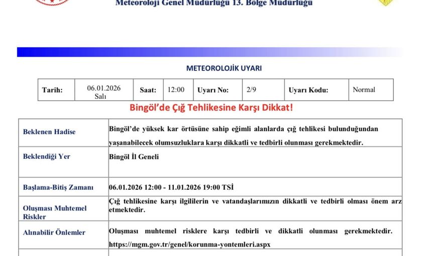 Yapılan açıklamada, "Bingöl’deki yüksek kar örtüsüne sahip eğimli alanlarda çığ tehlikesinin bulunduğu bildirilmiştir. Bununla birlikte, yaşanabilecek olumsuz durumlar karşısında vatandaşların dikkatli ve tedbirli olması gerektiği vurgulanmıştır." denildi.