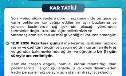 Bingöl Valiliği tarafından yapılan açıklamada, "Son meteorolojik verilere göre, ilimiz genelinde bu gece ve yarın aşırı buzlanma ve yüksek kesimlerde çığ riski beklenmektedir. Bu nedenle öğrencilerimizin ve vatandaşlarımızın can ve mal güvenliğini korumak amacıyla, 12 Ocak 2026 Pazartesi günü il merkezimiz ile ilçelerimizdeki resmi ve özel tüm eğitim kurumlarıyla kreş ve gündüz bakımevlerinde eğitim ve öğretime 1 gün süreyle ara verilmiştir." denildi.