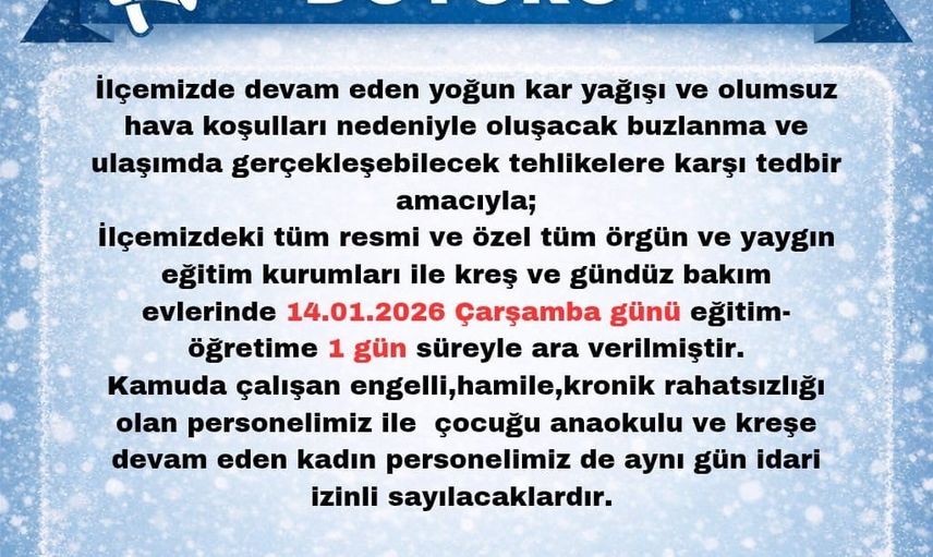 Bingöl'de süren kar yağışı, günlük hayatı olumsuz etkiliyor. Bu durum çerçevesinde, Kiğı, Karlıova ve Adaklı kaymakamlıkları tarafından yapılan açıklamada, devam eden kar yağışı ve buzlanma gibi sorunlar göz önünde bulundurularak, 14 Ocak 2026 Çarşamba günü ilgili ilçelerdeki resmi ve özel tüm eğitim kurumlarında eğitim ve öğretime 1 gün ara verildiği belirtilmiştir.