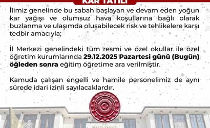 Valilik, "İlimiz genelinde meydana gelen bu olumsuz hava şartlarına bağlı olarak buzlanma ve ulaşımda oluşabilecek risklere karşı; il merkezi kapsamındaki tüm resmi ve özel okullar ile özel öğretim kurumlarında 29.12.2025 tarihli öğleden sonra eğitim öğretime ara verilmiştir. Ayrıca kamuda çalışan engelli ve hamile personel de bu süre zarfında idari izinli sayılacaklardır" ifadelerini kullandı.