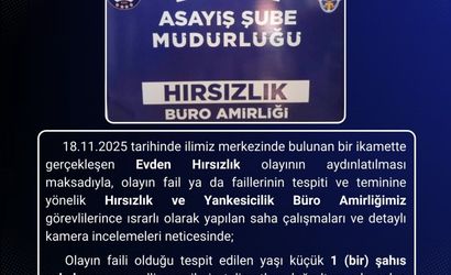 Bingöl İl Emniyet Müdürlüğü'nden yapılan resmi açıklamada, "18.11.2025 tarihinde merkezdeki bir ikamette meydana gelen ev hırsızlığının aydınlatılması amacıyla, Hırsızlık ve Yankesicilik Büro Amirliğince yapılan titiz saha çalışmaları ve detaylı kamera incelemeleri sonucunda, olayla bağlantılı bir şahıs tespit edilmiştir. Adli süreçler gereği yaşı küçük olan bu şahıs, çocuk suçlu sıfatıyla işlem görüp, tutuklanarak Diyarbakır Kapalı Çocuk Cezaevine teslim edilmek üzere gönderilecektir." denildi.